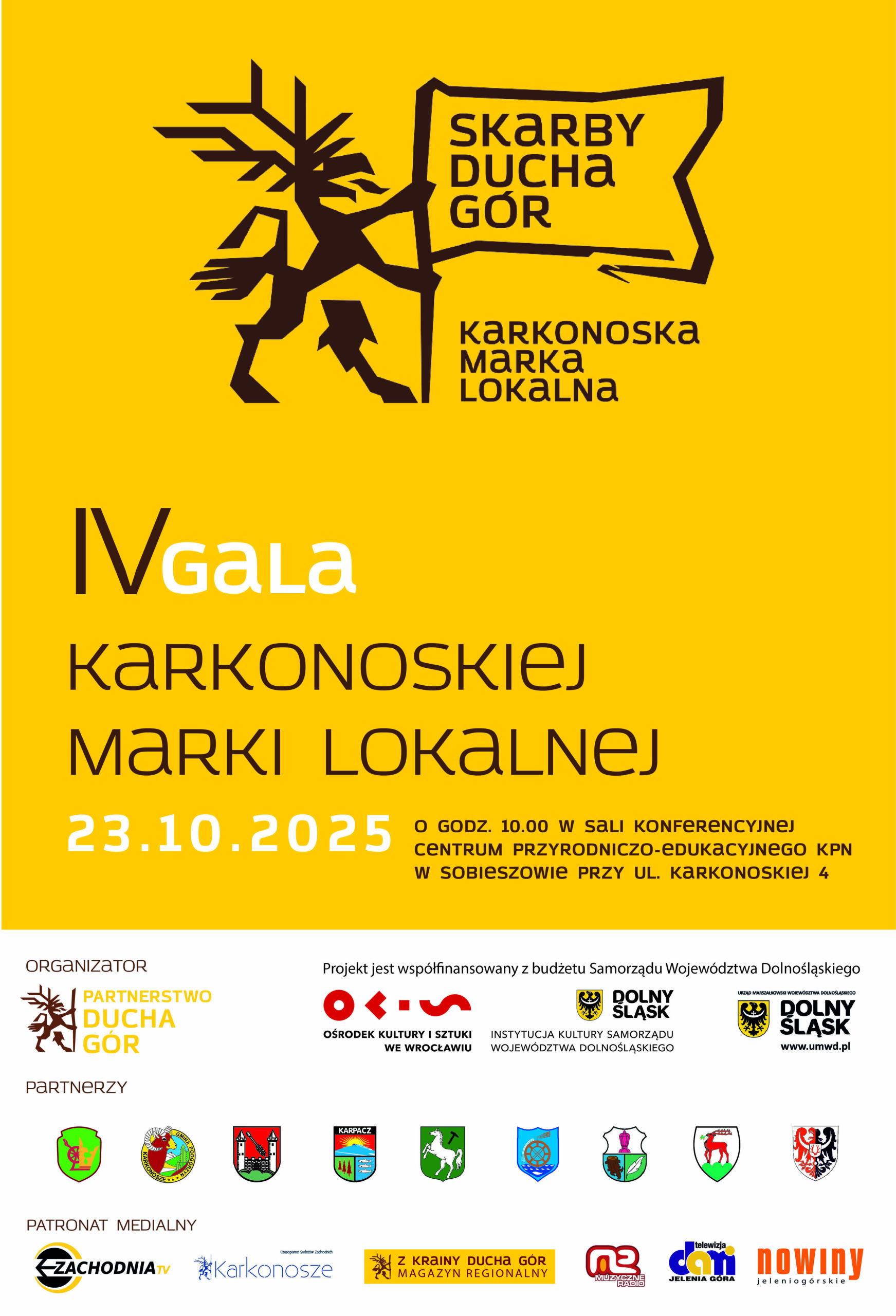 Zapraszamy na galę karkonoskiej marki lokalnej 23 października 2025 w Centrum Przyrodniczo-Edukacyjnego Karkonoskiego Parku Narodowego w Sobieszowie. W programie wystawa artystów, rzemieślników i producentów lokalnych, dyskusje o literaturze i sztuce regionu oraz koncert grupy „Chodź na słowo”. pokaż więcej »