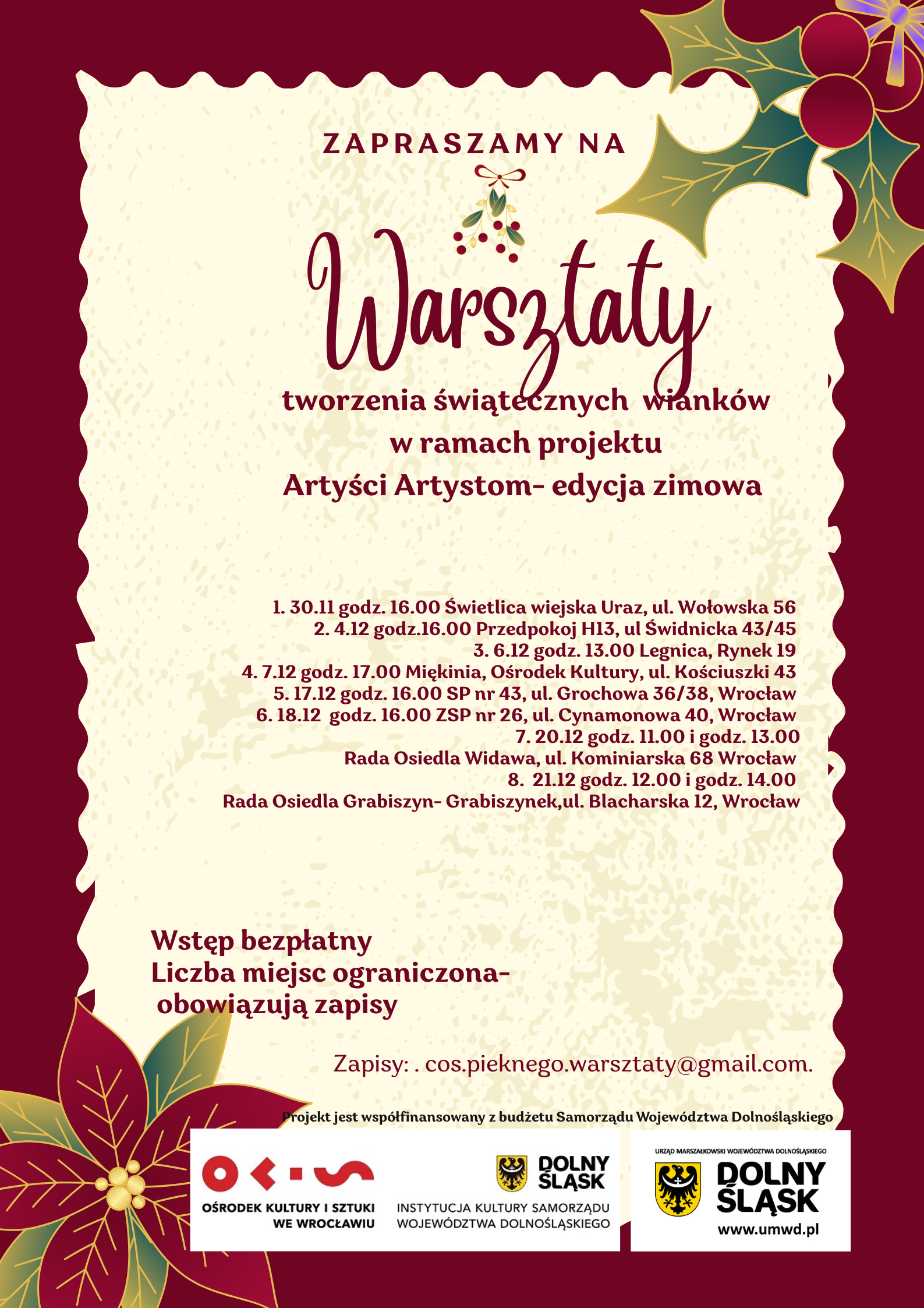 Cykl bezpłatnych warsztatów artystycznych pod hasłem „Artyści Artystom”, podczas których uczestnicy wykonują świąteczne artystyczne formy – wianki i stroiki. Warsztaty skierowane są do osób dorosłych i dzieci. pokaż więcej »