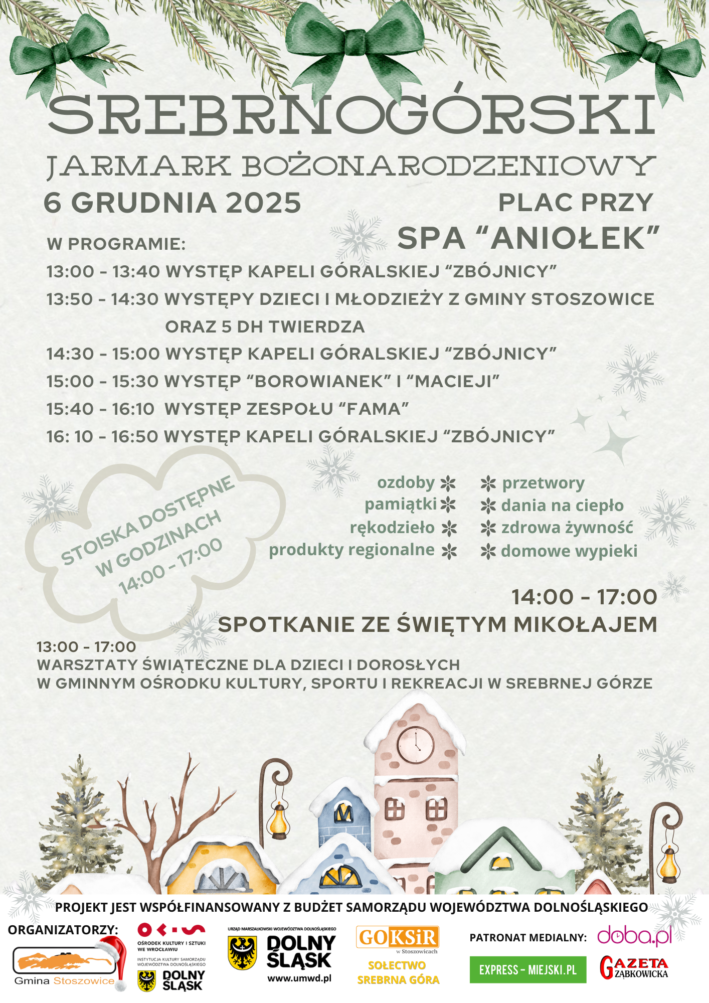 6 grudnia zapraszamy wszystkich do Srebrnej Góry na Srebrnogórski Jarmark Bożonarodzeniowy. W programie świąteczne kramy pełne przysmaków i słodkich łakoci, rękodzieło i ozdoby wykonane przez lokalnych rzemieślników, twórców i rękodzielników, warsztaty świąteczne, ognisko z kiełbaskami i grzane wino. Wszystko upiększą występy artystyczne dzieci, młodzieży, drużyny harcerskiej oraz zespołów śpiewaczych. Gośćmi jarmarku będzie kapela góralska Kapela Góralska Howerna, z którą poćwiczymy śpiewanie kolęd i pastorałek. Najmłodszych uczestników jarmarku odwiedzi gość specjalny – Święty Mikołaj. Serdecznie zachęcam, abyśmy razem spędzili to popołudnie i wspólnie rozpoczęli przedświąteczny czas oczekiwania na Boże Narodzenie .