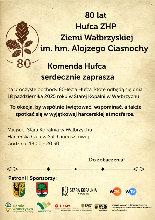 Gala z okazji 80-lecia działalności harcerstwa w powiecie wałbrzyskim pomyślana została jako symboliczne podsumowanie ośmiu dekad pracy wychowawczej, społecznej i obywatelskiej, realizowanej na rzecz dzieci i młodzieży. Zgromadzi kilkuset gości: zuchów, harcerzy i instruktorów ZHP, przedstawicieli samorządu, instytucji publicznych, organizacji społecznych oraz partnerów, którzy wspierali rozwój harcerstwa. Wydarzenie będzie nie tylko okazją do wspomnień i podziękowań, ale także zaakcentowania wartości, które niesie harcerstwo: służby, braterstwa, odpowiedzialności, patriotyzmu oraz wychowywania młodych ludzi na świadomych i aktywnych obywateli.