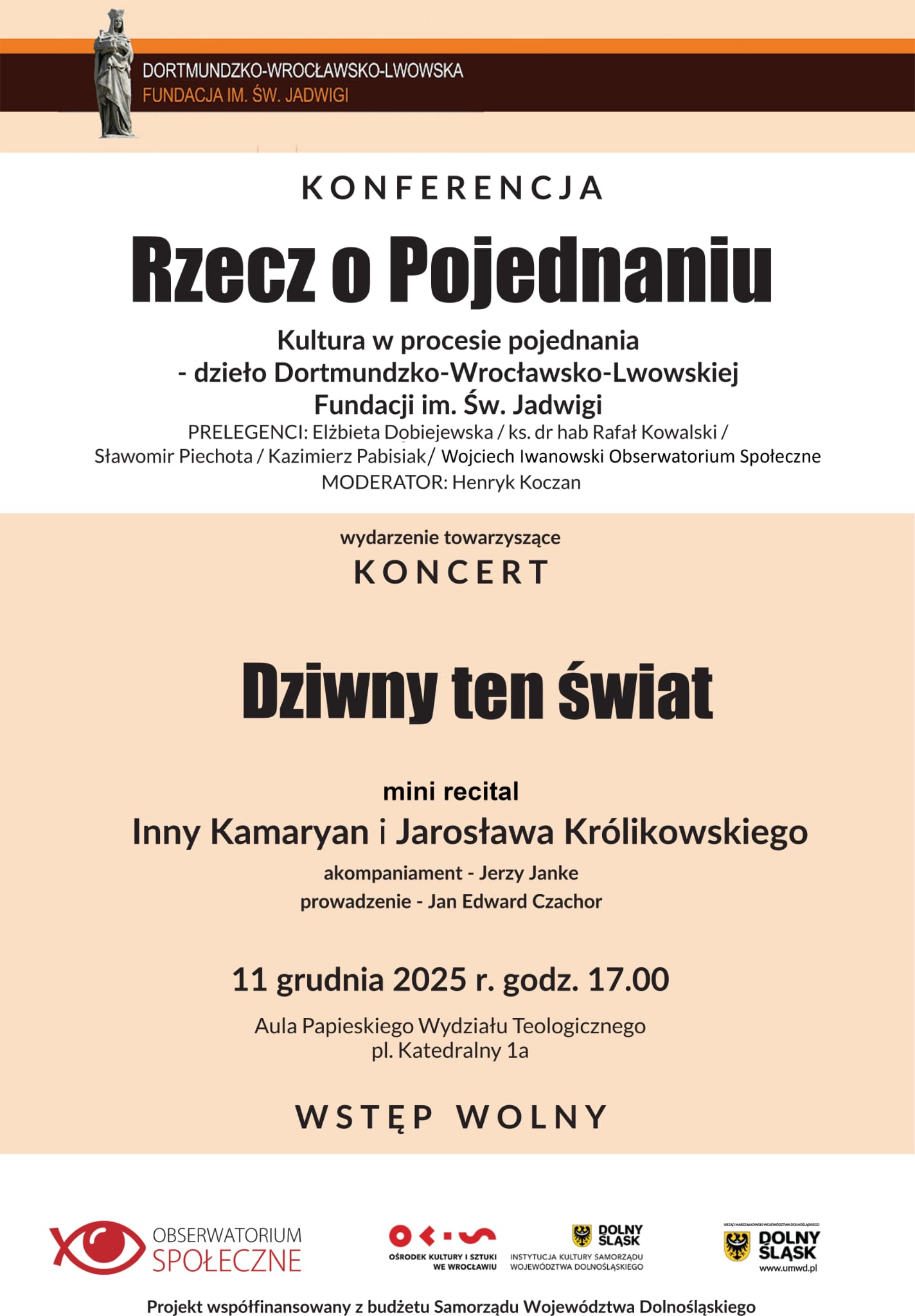 11 grudnia w Auli Papieskiego Wydziału Teologicznego we Wrocławiu odbędzie się konferencja dotycząca „Kultury na Dolnym Śląsku w dziele pojednania pomiędzy Polską i Niemcami”. Wydarzeniu towarzyszyć będzie koncert „Dziwny jest ten świat”