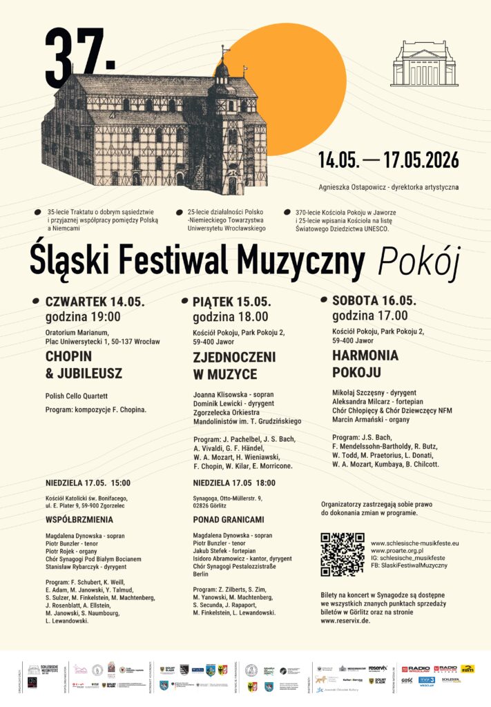 37. Śląski Festiwal Muzyczny odbędzie się w dniach 14–17 maja 2026 roku we Wrocławiu, Jaworze, Zgorzelcu i Görlitz. Wydarzenie, prowadzone artystycznie przez Agnieszkę Ostapowicz, prezentuje wybitnych artystów polskich i niemieckich, a program obejmuje dzieła chóralne i instrumentalne – od muzyki klasycznej po repertuar synagogalny. Festiwal włącza się w obchody 35-lecia Traktatu o dobrym sąsiedztwie i przyjaznej współpracy pomiędzy Polską a Niemcami oraz 25-lecia Niemiecko-Polskiego Towarzystwa Uniwersytetu Wrocławskiego. Koncerty odbywają się w Oratorium Marianum Uniwersytetu Wrocławskiego, w Kościele Pokoju w Jaworze, w kościele św. Bonifacego w Zgorzelcu oraz w Synagodze w Görlitz. Finałowe wydarzenia w Zgorzelcu i Görlitz stanowią wyjątkowe spotkanie kultur i religii, ukazujące ciągłość i różnorodność tradycji muzycznej Europy. Muzyka wykonywana przez artystów z Polski i Niemiec staje się przestrzenią wspólnego doświadczenia ponad granicami i językiem pokoju.