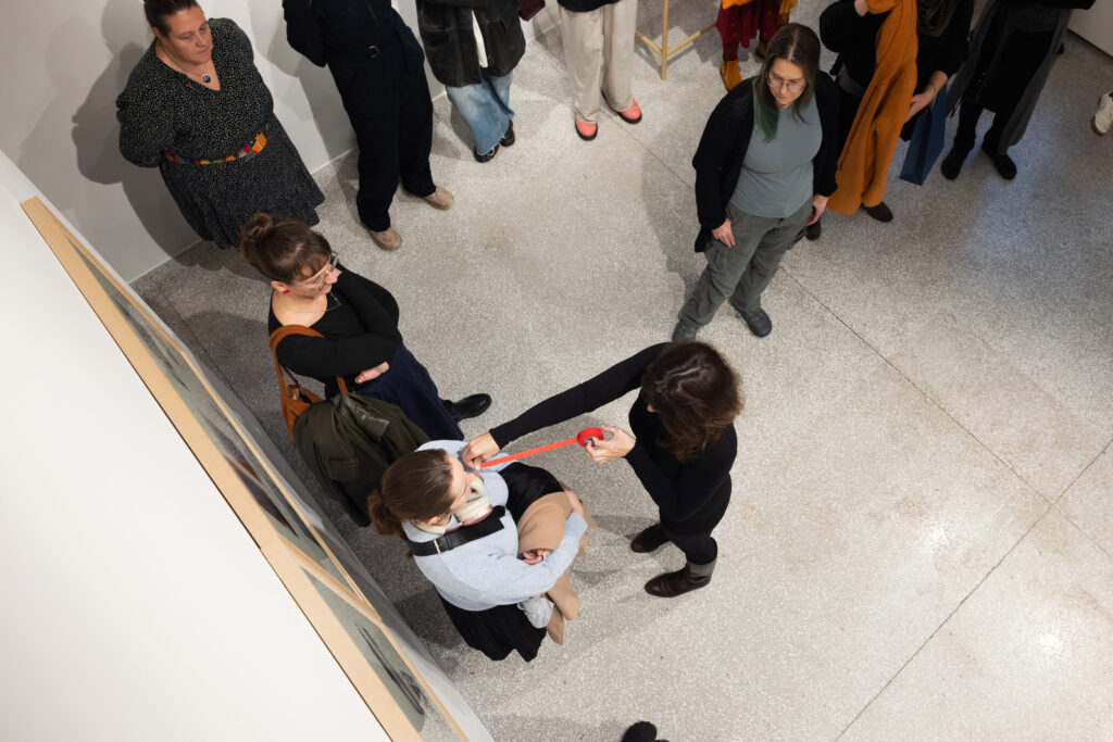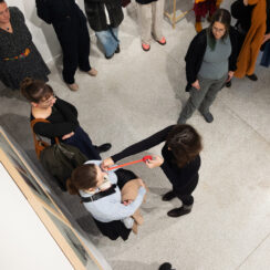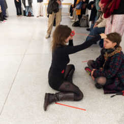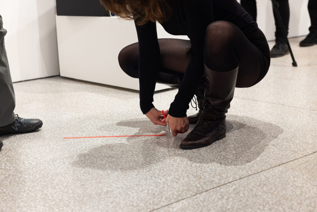 The Tape to angażujący publiczność performans, który bada napięcie między bliskością a dystansem. Inspiracją dla niego była powieść Italo Calvino „The Distance of the Moon” (1965), w której księżyc w pełni zbliża się do Ziemi tak bardzo, że ludzie mogą wspiąć się na niego z łodzi za pomocą drabin. Praca ta reinterpretuje grawitację jako siłę, która nie tylko oddziałuje między ciałami niebieskimi, ale także jako siłę ludzkiego pragnienia. W opowiadaniu Calvino, kiedy żeglarze znajdują się na Księżycu, odczuwają zmieniające się siły między dwoma światami – znana im grawitacja Ziemi znika, a zastępuje ją siła przyciągania Księżyca. W tym przypadku taśma staje się metaforą tej kruchej atrakcji: materiałem, który wiąże, ale także uwalnia, mierzy i utrzymuje w miejscu. Podobnie jak drabina w opowiadaniu Calvino, taśma jest zarówno mostem, jak i więzią – sposobem na utrwalenie ulotnej bliskości lub, jako jej pozostałość, znakiem rozłąki. Pomiędzy Ziemią a Księżycem. Pomiędzy tobą a mną.