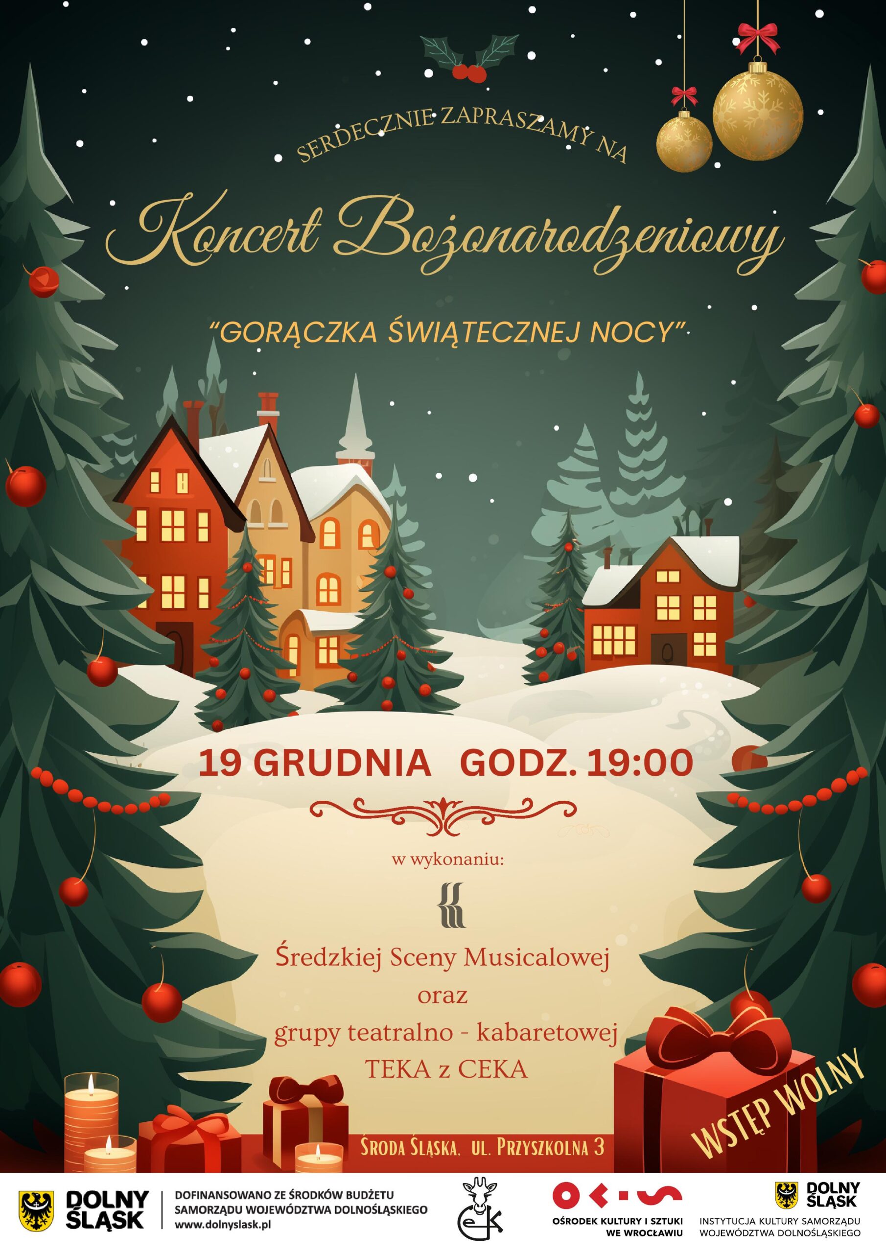 19 grudnia zapraszamy do Środy Śląskiej na Koncert Bożonarodzeniowy „Gorączka świątecznej nocy” w wykonaniu Średzkiej Sceny Musicalowej oraz grupy teatralno-kabaretowej TEKA z CEKA.