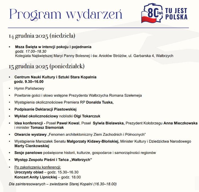 14 i 15 grudnia miasto Wałbrzych stanie się areną centralnych obchodów 80. rocznicy włączenia Ziem Zachodnich i Północnych do Rzeczypospolitej Polskiej. Wydarzenie zwieńczy koncert Anity Lipinickiej w Starej Kopalni. pokaż więcej »
