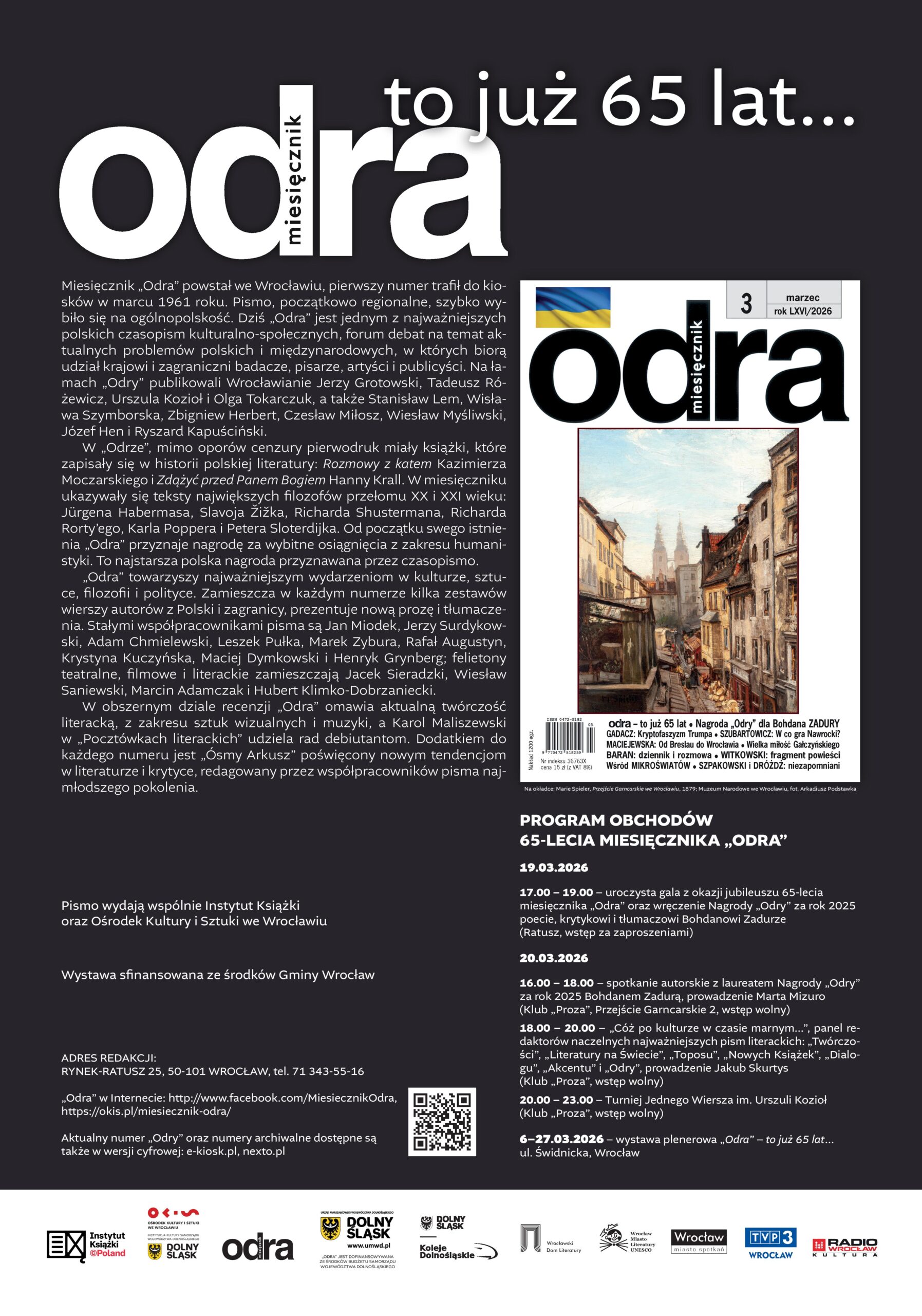 W tym roku legendarny wrocławski miesięcznik „Odra” świętuje swój jubileusz 65-lecia. Z tej okazji przygotowano wystawę plenerową, której ekspozycja potrwa od 6 do 27 marca na ulicy Świdnickiej we Wrocławiu. Serdecznie zapraszamy. pokaż więcej »
