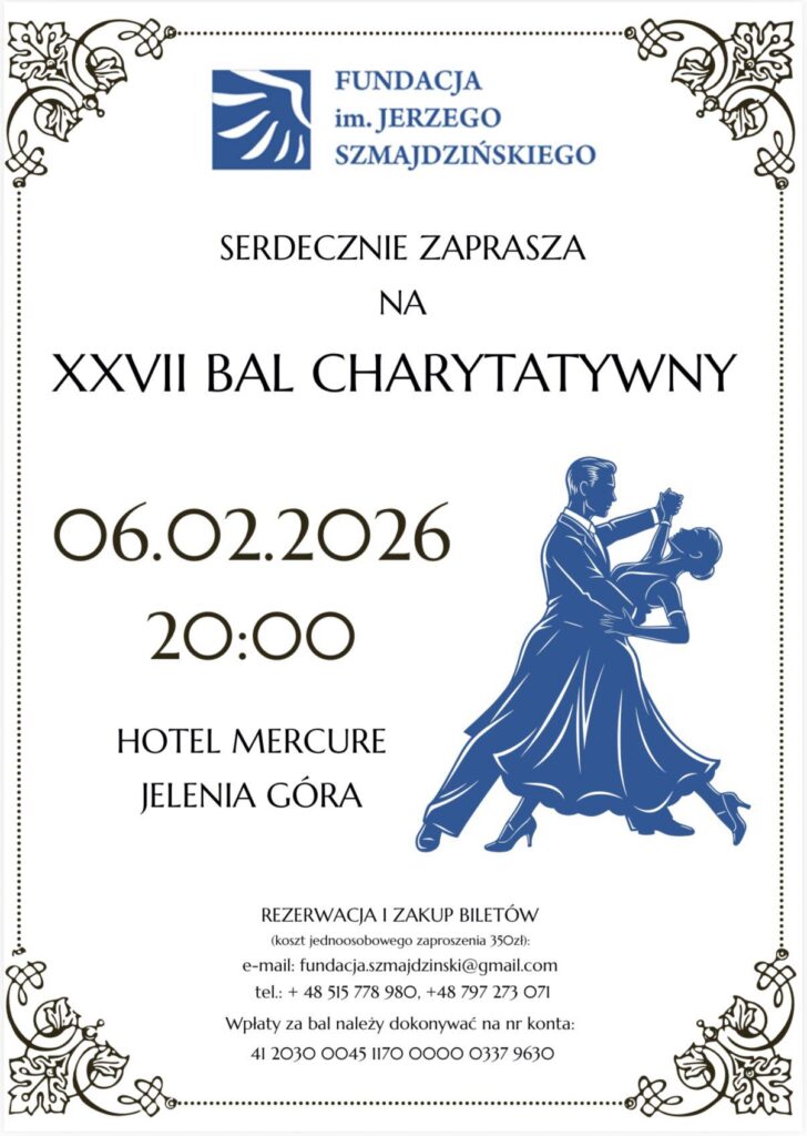 Zapraszamy na XXVII Bal Charytatywny, którego celem zdobywanie środków na stypendia edukacyjne dla dzieci i młodzieży z naszego regionu. Wydarzenie odbędzie się w piątek 6 lutego 2026 w Hotelu Mercure w Jeleniej Górze. Karnawałowej rozrywce towarzyszyć będzie m. in. licytacja darów przekazanych na rzecz dobroczynnych działań fundacji.